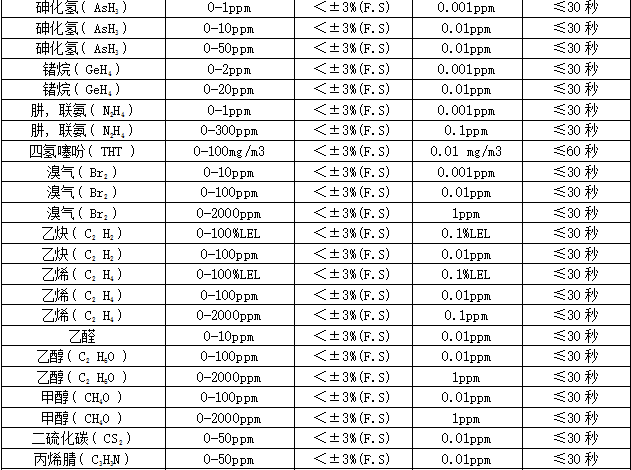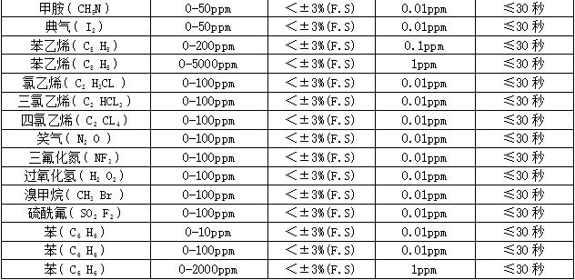 部分可檢測氣體列表: