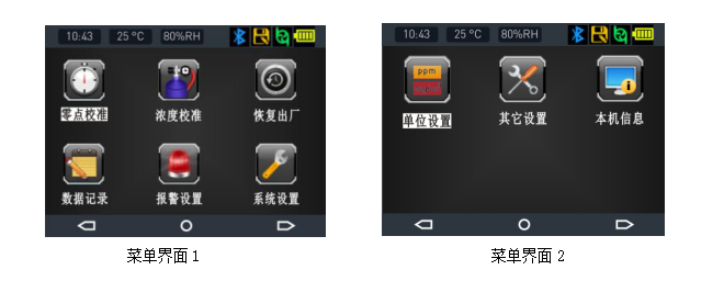 ●2.31英寸高清彩屏顯示實(shí)時(shí)濃度、報(bào)警、時(shí)間、溫度、濕度、存儲、通信、電量、 充電狀態(tài)等信息,菜單界面采用高清仿真圖標(biāo)顯示各個(gè)菜單的功能名稱